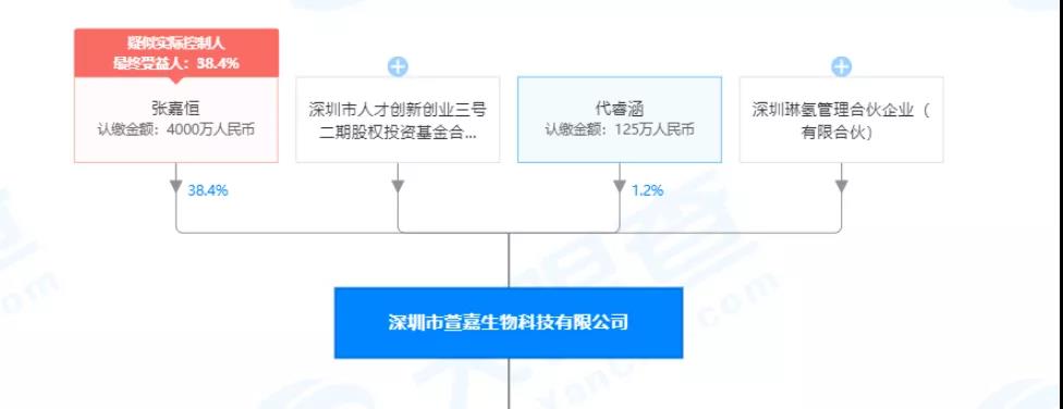 据天眼查显示,深圳市萱嘉生物科技有限公司成立于2017年2月21日,实缴资本为3916.6667万元,张嘉恒担任法人、董事长、总经理,持股38.40%,刘婷婷等人担任董事。
