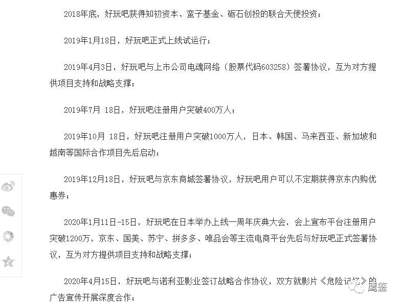 该文章还称,“好玩吧”从正式上线试运行到今年的4月15日平台注册用户为16468956人。“好玩吧”从2018年底到2020年4月15日期间,先后获得知初资本、蛮子基金、砺石创投的联合天使投资,并与京东、国美、苏宁、拼多多、唯品会等主流电商平台,以及诺利亚影业、电魂网络先后正式签署协议,互为对方提供项目支持和战略支撑。