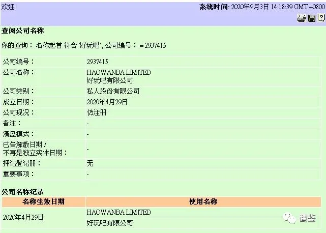 那么,“好玩吧”APP是哪家公司旗下的产品呢?操盘手又是谁呢?据“好玩吧”APP多次发布的公告显示,“好玩吧”APP属于香港好玩吧有限公司旗下的应用软件。鹰鉴通过香港查册中心网站上查询到,香港好玩吧有限公司实际名称是好玩吧有限公司,注册时间是2020年4月29日。