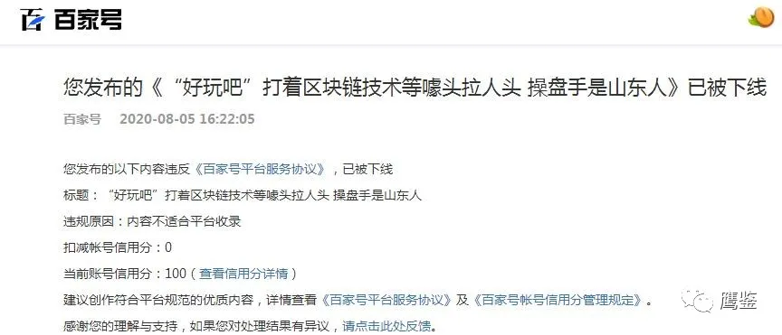 8月5日,有公关公司联系鹰鉴让我们删除发布的《“好玩吧”打着区块链技术等噱头拉人头 操盘手是山东人》文章,并承诺给“辛苦费”。当鹰鉴拒绝后比较诡异的事情发生了。当天下午4点22分该篇预警文章却被强制下线了。