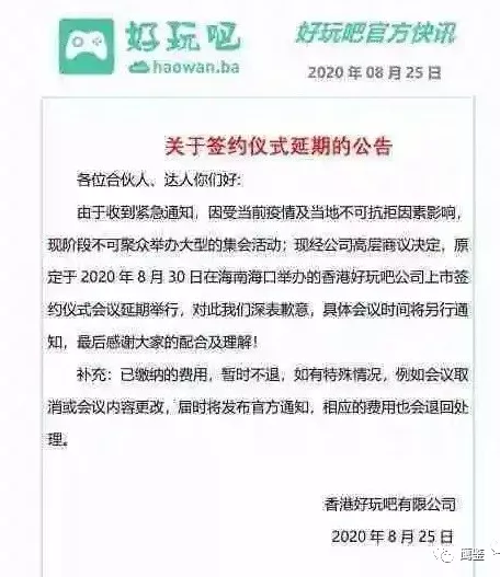 8月25日,好玩吧有限公司突然发布公告表示好玩吧香港上市签约仪式将进行延期举报。其理由是“受当前疫情影响以及当地不可抗拒因素影响。”