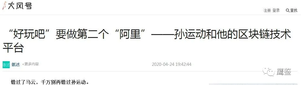 另外,鹰鉴通过网上查阅到一篇标题为《“好玩吧”要做第二个“阿里”——孙运动和他的区块链技术平台》的文章。该文章笔者称,好玩吧”要依托区块链技术和社群经济做第二个“阿里”。