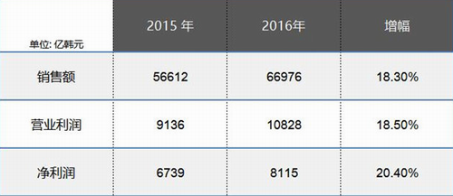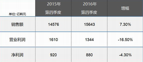 数据显示,集团2016年第四季度的销售额为15643亿韩元(约合94亿人民币),同比增长7.3%,不及全年增幅的一半。营业利润下滑16.5%,净利润下滑4.3%。