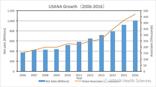 2月份,USANA公开2016年全年财务数据,显示其销售额、特许专营商数量、每股利润,再次达到新高度,其中全球销售额超过10亿美元,USANA保持了连续14年的高速增长,年度增长幅度达9.5%。