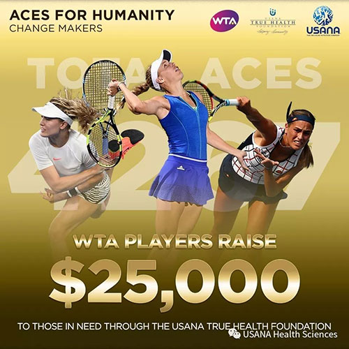 10月30日,WTA(世界女子网球协会)宣布,向USANA捐款25000美元,以支持其为全世界受灾群众以及困难人群提供基本必需品的工作。该善款的筹集源自本年度WTA与USANA合作开启的“Aces慈善”推广活动。