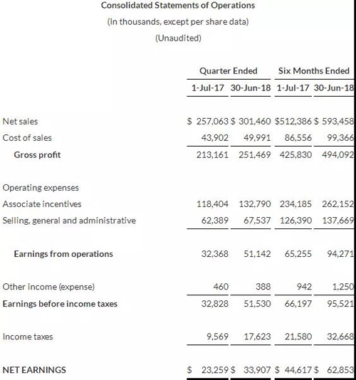 2018年上半年,USANA实现销售额 (Net Sales) 5.93亿美元,同比增15.82%;实现净利润 (Net Earning) 6285万美元,同比增40.87%。