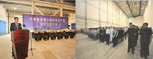 2014年6月26日,在李金元董事长、白萍总裁的高度关注和支持下,围绕“强化红线意识 推进安全发展”为主题的“第十届安全生产月技术比武大会”在天狮集团国际健康产业园隆重举行。每年六月份是天狮集团安全生产活动月,此次活动将本届安全月系列活动推向顶峰。