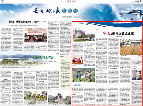 7月23日,湖南日报以“长风破浪会有时——全省直销行业系列报道”为主题,分别以“直销,我们准备好了吗?”、“借力好风上青云”、“华莱:欲与立顿试比高”为题进行了专版报道。文中全面阐述了华莱成长壮大的发展历程,包括华莱全力申请直销经营许可证、积极推广安化黑茶、打造安化黑茶公共品牌、大力修建黑茶种植生产基地等多项有利于行业发展、企业壮大的举措,从而实现了企业与行业、合作伙伴、茶农、员工的多方共赢,并由此发展成为一家产品领先、服务领先、科技领先、人才领先的现代化三农企业。