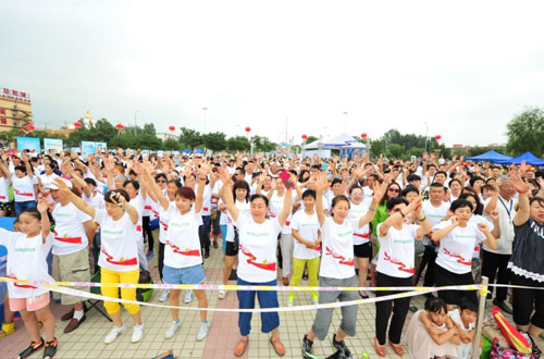 在体脂测量区,嘉康利工作人员为市民们测量体脂情况,我们了解到,由于内蒙古地区有食牛羊肉的习惯,很多人的体脂含量过高,容易处于亚健康状态。饮食均衡是保证个人健康的首要条件,为此,活动中工作人员邀请市民品尝专为减脂研发的嘉康利代餐奶昔。舞台正前方,几百名领到了标有“嘉康利全民健身万里行”字样T恤的市民,在纤奇教练带动下,随着动感音乐学跳起健身操,一曲热门的“小苹果”嗨翻全场,展示出所有人的魅力、活力、生命力。在体能挑战区,记者惊讶的看到,一位腿部有残疾的男士也参与了“平板撑”体能比拼,只能单腿支撑身体的他汗如雨下,但是脸上却洋溢着快乐和自信,他不服输的精神深深的感染了观众们,自发为他加油,充分显示出运动的全民参与性。