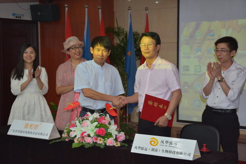 签约仪式在英德市我和你食品有限公司副董事长张庆婵女士、常务副总经理梁小凤女士,风华致远(湖南)生物科技有限公司执行总经理杨洋先生、副总经理蒋拥军先生地见证下,英德市我和你食品有限公司董事总经理杨献钊先生与风华致远(湖南)生物科技有限公司董事总裁谢最华先生签订合约,正式达成战略合作伙伴关系。