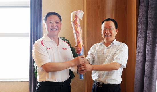 海阳市市委书记姜仕礼(右)把亚洲沙滩运动会火炬赠送给董事长徐之伟(左)