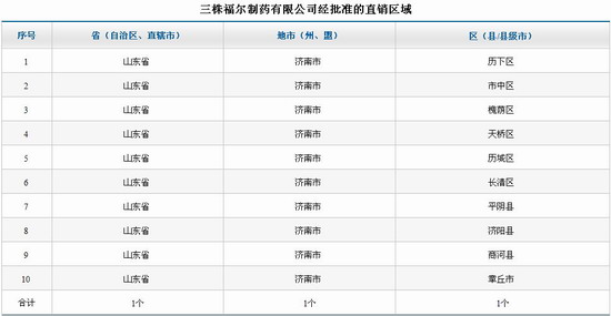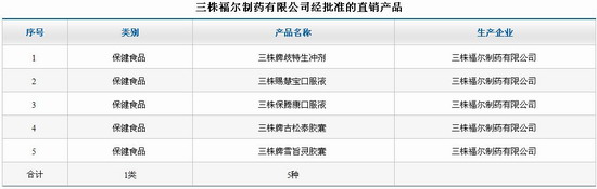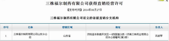 8月27日,商务部直销行业管理信息系统上公示了三株福尔制药有限公司获得直销经营许可的信息,成为第45家拿牌直销企业。此次获批的直销区域为山东省济南市的10个区县市,而获批的直销产品有三株牌歧特生冲剂、三株赐慧宝口服液、三株保腾康口服液、三株牌古松泰胶囊、三株牌雪旨灵胶囊5中保健食品。