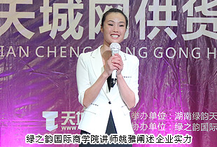 随后,绿之韵国际商学院讲师姚雅从雄厚的企业实力、专业的领军人物、强大的政府支持、长久的历史使命和全面的服务支持以及商品的优质等几个层面,系统阐述了绿之韵“天城网”的优势所在,将绿之韵集团天城网电子商务平台的优势展现无遗,并为在座商家规划了一个宏伟蓝图!