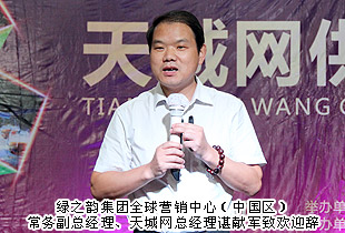 会上,在全场热烈的掌声中,绿之韵集团全球营销中心(中国区)常务副总经理、天城网总经理谌献军致欢迎辞,以“共赢”为目标,向参会商家表达了绿之韵发展电子商务的决心,以及与各合作商家合作赢未来的信心,并且表示在绿之韵第二个十年发展道路上,天城网是作为新十年中的重中之重的项目,是绿之韵发展电子商务直销的先锋平台。