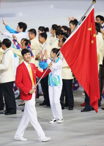 当地时间19日18时,第17届亚运会正式开幕,以“45亿的梦想,同一个亚洲”为主题的开幕式在韩国仁川主体育场上演,1入场仪式上中国代表团是第31个出场,旗手为击剑奥运冠军雷声。据了解,在以往的大型运动会上,中国代表团开幕式旗手多由篮球运动员担任,2008年北京奥运会和2012年伦敦奥运会的旗手分别是姚明和易建联。