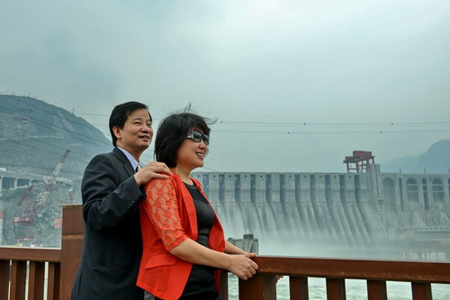 陈怀德、胡静在向家坝水电站前合影留念
