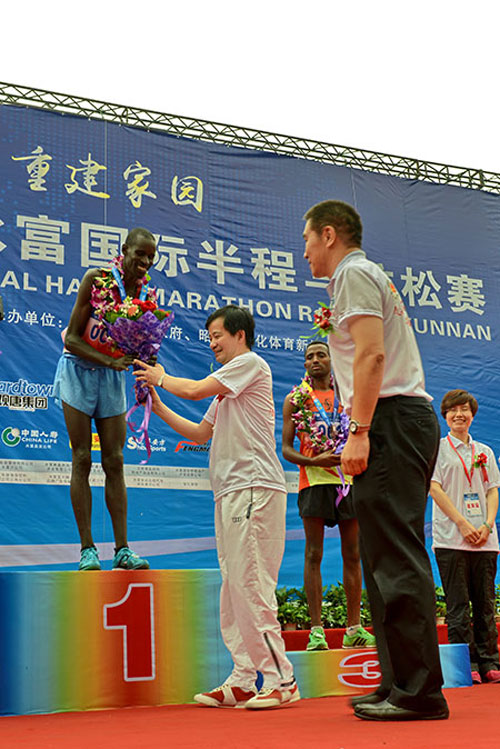 陈怀德在起跑仪式结束后,随即加入富迪千人方队,和胡静以及全体参赛者一起,本着体会“挑战自我,超越极限,坚韧不拔,永不放弃”的马拉松精神,尽情地奔跑,用脚步丈量着这座年轻的水富县城,以奔跑这种健康的生活方式表达对地震受灾群众的慰问与关心。