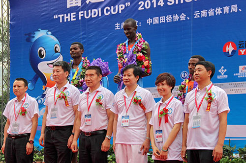 半程马拉松男子组冠亚季军与陈怀德等嘉宾领导合影