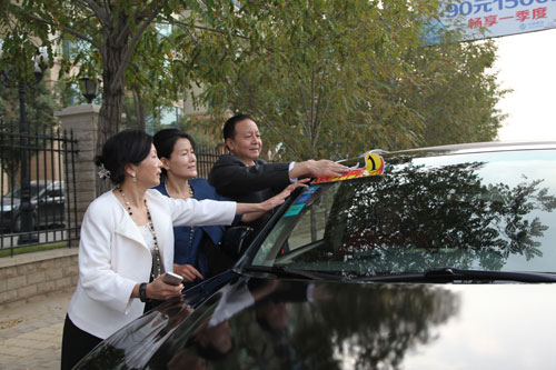 尚赫公益大使董丽萍副总、董丽霞副总及董剑义副总共同为爱心车队贴上车标