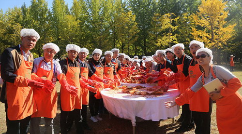 南怡岛作为《冬季恋歌》等多部电视剧的拍摄地,拥有得天独厚的美丽景观,岛四周生长着像屏风一样郁郁葱葱的栗子树和白杨树,此次制作泡菜的地点就选在这得天独厚的户外。隆力奇经销商们身穿橙色战袍,头戴厨师帽、套上塑料手套,俨然一副全副武装的厨师,八人一桌,十人一组开始了制作泡菜的过程。韩国泡菜是由香料、新鲜蔬菜、盐渍海产品制成的韩国传统发酵食品,它几乎可以搭配任何餐食,是韩国人餐桌上的重要配菜。在专业泡菜老师的指导下,了解了制作泡菜分拣、腌制、上酱等过程,经销商们迫不及待地忙得不亦乐乎,尝一口自己亲手做的泡菜,那味道别提有多美妙了。此次由隆力奇千人旅游团腌制的泡菜将捐献给春川市立养老院。