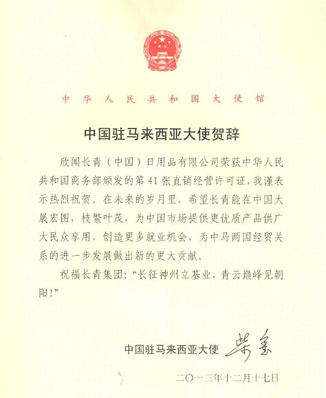 在CNI长青中国获得直销经营许可证之际,拿督柴玺曾经寄语CNI长青中国:“在未来的日子里,希望CNI长青能在中国大展宏图,枝繁叶茂,为中国市场提供更优质的产品供广大民众享用,创造更多就业机会,为中马两国经贸关系的进一步发展做出新的更大贡献。祝福CNI长青:长征神州立基业,青云巅峰见朝阳。”CNI长青中国希望借大使的祝福,不懈努力,再创佳绩。