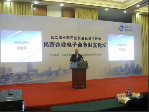 2014年10月17日下午,由全国工商联、天津市人民政府合作举办的“第二届全国民企贸易投资洽谈会——民营企业电子商务财富论坛”在天津市滨海新区成功召开。天津市政府、市商务委相关领导、全国知名民企负责人、电子商务领军企业行业精英等约百余人出席会议。天狮集团李金元董事长作为演讲嘉宾应邀出席会议。