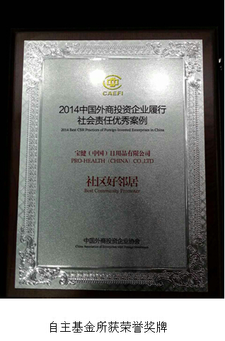 2014年12月5日,宝健3个1%爱心志愿者再获荣耀。宝健3个1%自主基金项目获得了由中国外商投资企业协会颁发的“履行企业社会责任优秀案例”的荣誉。宝健公司总裁李道代表宝健1%爱心志愿者出席会议接受中国外商投资企业协会会长陈德铭、中国外商投资企业协会名誉会长石广生亲自颁发的铭牌。同时,作为优秀案例的代表,宝健受邀上台,与其他优秀的外资企业代表分享“3个1%“公益理念。与会专家点评到“宝健的公益理念通过建立公益基金的方式,让公益活动与企业理念、社会责任结合,并让公益行为更有持续性。”