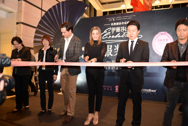 为了让广大市民提前体验濒临没落的奥匈帝国的极尽奢靡,欧洲大陆皇室关系的错综复杂,以及茜茜公主伊丽莎白传奇的一生,11月27日晚,主办方上海文化广场携手克丽缇娜集团在静安嘉里中心举办了《伊丽莎白》服装展揭幕仪式,并由音乐剧中的女主演Roberta Valentini(罗蓓尔塔•瓦伦蒂尼)、男主演Maximilian Mann(马克西米利安•曼恩)携手克丽缇娜国际学院暨哲美学院营运长赵承佑先生、《伊周》助理出版人暨主编邓堪先生、上海东方票务有限公司总经理苏铮女士及上海文化广场剧院管理有限公司总经理张洁女士一起隆重揭幕。