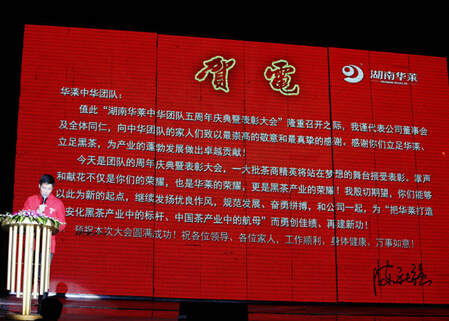 4月12日,腾飞2015华莱中华团队五周年庆典暨表彰大会在省会长沙隆重召开,湖南省工商行政管理局副局长、正厅级巡视员、湖南省直销及门店销售协会名誉会长叶华庆,湖南省工商行政管理局打击传销办原副主任、湖南省直销及门店销售协会常务副会长兼秘书长师新民,安化县冷市镇党委书记周华山、安化县冷市镇党委副书记、常务副镇长李刚跃等领导出席盛会。公司总裁张先枚、总经理龙明华等高层领导受邀出席,与来自全国各地的近3000位茶商共同庆祝本次盛会,并为优秀茶商、优秀团队颁奖。