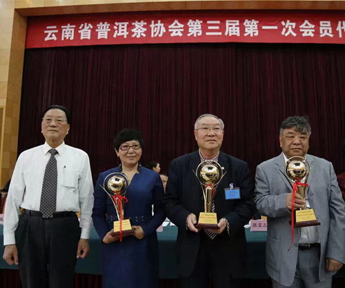 理想大学茶学院名誉院长邵宛芳教授(右一)当选为新一届云南省普洱茶协会常务副会长