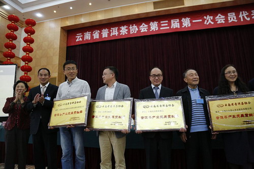 云南龙润茶业集团副总裁杨贵良(右三)代表集团接受"普洱茶产业发展贡献奖"殊荣