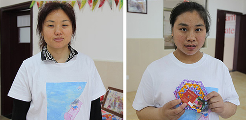 在三楼的手工艺品展览室,绿之韵的志愿者们进入到了属于孩子们自己的奇妙世界:一幅幅想象力丰富的的彩色画作、各种各样精致的手工作品。手工室张永红老师告诉志愿者们,她来服务中心已经9年,从一开始的护理员,到自学手工给孩子教学,照料好这些孩子需要付出超出常人的耐心和勇气。问及为何能够坚持这么多年,她说,就像爱自己的孩子一样,爱着爱着就成了习惯。