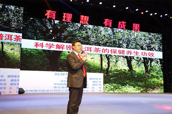 在聚光灯下,伴随着激扬的音乐、热烈的掌声,我国茶叶科学和植物功能成分开发利用研究领域的著名专家、国家茶学学科带头人刘仲华教授,走上舞台,同与会的3000多名经销商分享普洱茶的保健功效与市场前景。