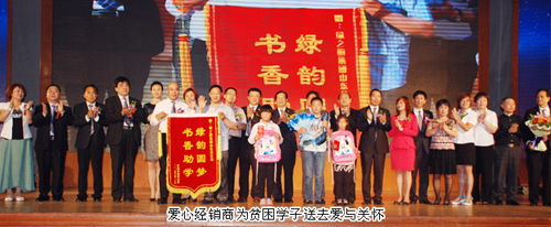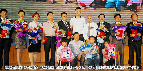 慈善是一种奉献,它是爱心与真情的体现;慈善是一种美德,它是真诚与美好的结晶。“承担责任、贡献爱心,回馈社会、造福国家”。绿之韵胸怀大爱,让博爱洒满每一个角落,一次次爱的行动,张扬着中华绿韵始终向善的风尚。在大爱文化的感召下,绿之韵山东爱心志愿者伸出家人般温暖的双手,为穷苦地区的贫困学子送去了爱与关怀。盛会上,校方代表回赠绿之韵山东分公司“绿韵圆梦·书香助学”荣誉锦旗。绿之韵山东市场发展委员张吉庆、谭佃选、申文高、朱建昌、马光录、王玉民、徐继法、李加勇、陈培英、高居同、臧延福、徐志敏、朱振华、谭清梅、王金兰、亓凤芹、曲圣军、卢纪华、周晏如、张美华、高玉霞、王炳英、马平、王芳、张金玲荣膺“绿之韵2015年度山东慈善大使”。绿之韵集团(中国区)副总经理(全球营销中心)刘维利先生、绿之韵集团山东分公司经理伍成辉先生为获奖者颁授奖项。