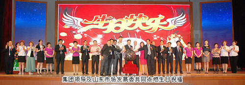 “祝山东分公司五周年生日快乐”、“祝贺山东分公司五周年庆典圆满成功、“山东,加油!加油!加油!”……一声声最诚挚的祝福想起,山东市场各个团队以视频的形式发来祝贺,大屏幕上也出现了集团董事常务副总裁劳嘉女士的殷切期望、胡国安董事长的鞭策与鼓励,让现场绿之韵人倍感亲切与激动。接着,集团领导及山东市场发展委成员上台共同启动生日祝福。悠扬的生日快乐歌响起,生日蛋糕推上舞台,一支支点亮的蜡烛像一颗颗跳动的心。每一句祝愿都饱含深情,每一张笑脸都绽放幸福。整个现场一片欢欣鼓舞,旗帜飞扬,掌声雷动,掀起了庆典的最高潮。