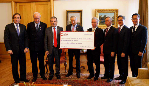 完美公司董事长古润金(右四)向智利外长穆尼奥斯(左四)移交捐赠支票