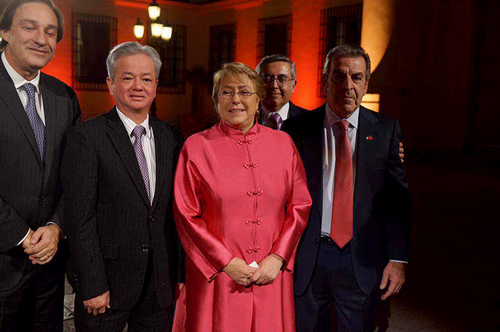 智利总统巴切莱特(中)与完美公司董事长古润金(左二)合影留念