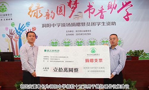 2015年5月28—29日,绿之韵“绿韵圆梦•书香助学”活动走进浏阳洞阳中学。为了改善青少年教育教学环境,共同关注孩子们健康成长,活动当天,湖南省光彩事业促进会副会长、长沙市光彩事业基金会理事长、绿之韵集团董事长胡国安先生代表湖南绿之韵公益基金会向洞阳中学捐赠10万元爱心款项用于该校爱心操场的建设。28日上午,湖南绿之韵公益基金会理事长、董事常务副总裁劳嘉女士与绿之韵优秀经销商周书明、苏龙辉夫妇一起走访了学校贫困学子的家庭,并给予经济资助。29日,湖南绿之韵公益基金会又将一批体育器材亲手送到了学生手中。绿之韵集团党总支部书记许达仲,湖南绿之韵公益基金执行秘书长蒋文,绿之韵集团办公室主任冯红,浏阳经济开发区团委副书记、绿之韵集团团支部书记李倩婷,湖南分公司业务经理刘磊,带领绿之韵党团成员以及近百位爱心经销商参与活动。