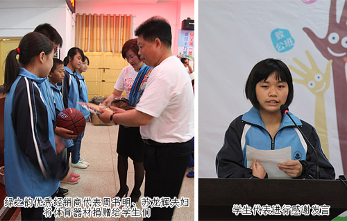 浏阳市洞阳中学是绿之韵工业园希望小学的直升中学,学校根据发展需要,决定更换原来的水泥操场为塑胶操场。当得知学校苦于资金困难,胡国安董事长代表绿之韵表示,将无偿为学校捐建塑胶操场,为孩子们提供一个安全、舒适的运动环境,为学校全面提升办学品位和全面实施素质教育创设良好环境。捐赠仪式上,湖南绿之韵公益基金会理事长劳嘉发表致辞,她表示:少年强则国强,青少年是祖国的未来,为学校捐建操场,为孩子们配备体育器材,给贫困学子给予经济资助,是绿之韵十二年来关注教育事业的举措之一。绿之韵希望通过这份爱心激励莘莘学子努力学习,同时能够起到抛砖引玉的作用,使社会更加重视知识和教育,关心人才的培养。她希望学子们在学习文化知识的同时加强体育锻炼,要学习好、身体好、品德好,健康快乐地成长,将来做对国家有用的人。