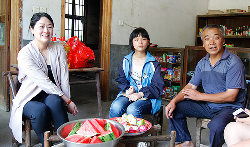 爱心志愿者一行快到达洞阳中学时,远远就看见一个穿着校服的娇弱女孩,左手抱着一个圆滚滚的西瓜。看见我们走近了,怯怯地笑了笑。站在一旁的班主任说:邓莎是个乖巧、懂事、乐观、上进的孩子。