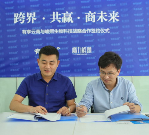 上海峻熙生物科技有限公司董事长李经济先生、有享云商总经理孔扬先生共同参加了此次会议!双方就合作方式、合作商品展开探讨,并达成了战略合作共识。这也意味着有享云商“大美丽”事业的正式开启!