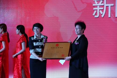 大连市工商行政管理局副局长荣梅(右)向双迪公司董事长兼总裁潘晓非颁发《直销经营许可证》
