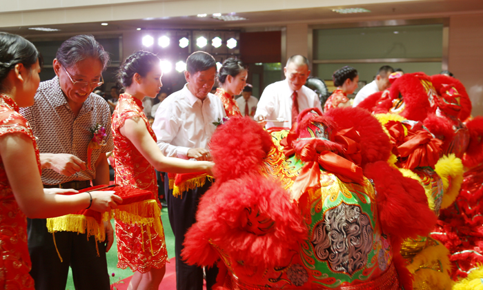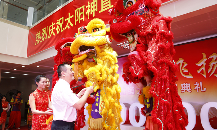在主持人的盛情邀请下,李必达、张继雄、怀汉新、朱厚丞上台,为雄狮点睛,点醒的雄狮焕发着新的活力,技艺精湛的舞狮人向众人展示着精彩的表演,博得现场欢呼喝彩不断,最后雄狮舞动、朱总接青,寓意太阳神财源滚滚、节节兴旺。