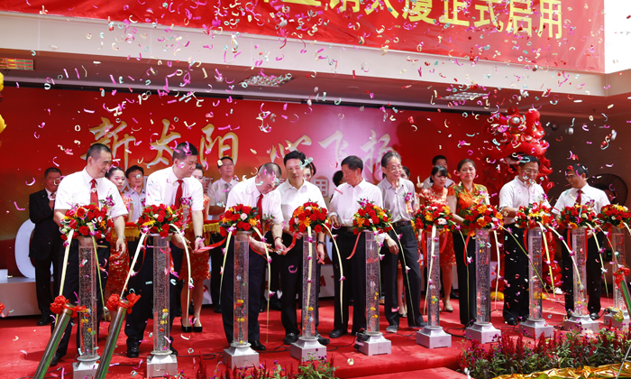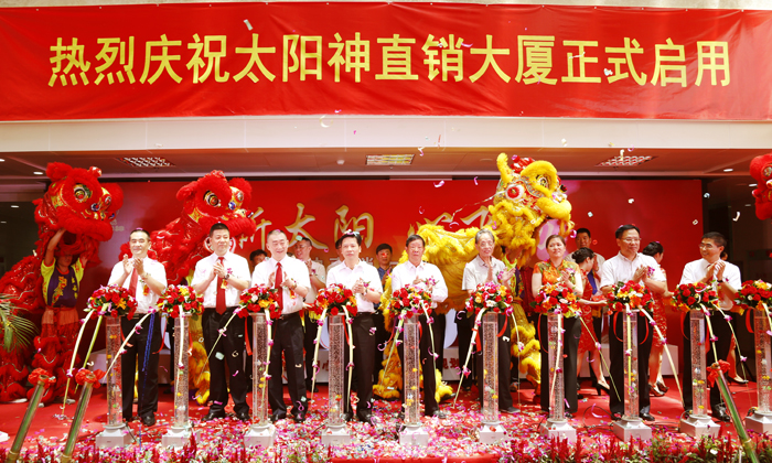 在一片欢腾声中,李必达、陈璟玥、张继雄、陈桂明、叶锦锐、怀汉新、宋杰、朱厚丞、张鸣先在11位经销商代表的陪同下,手持金剪刀,一起为太阳神直销大厦剪彩揭幕,六门礼炮同时响起——“太阳神直销大厦”正式启用!