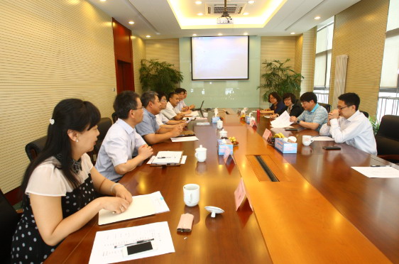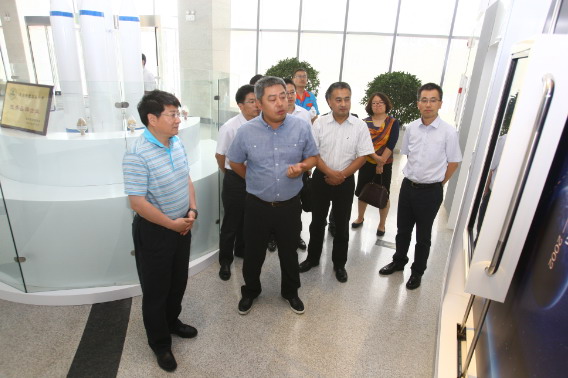 邱斌总裁(中)向李忠宝(左一)副 院长介绍公司发展历程