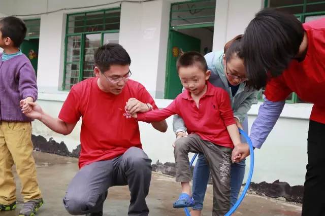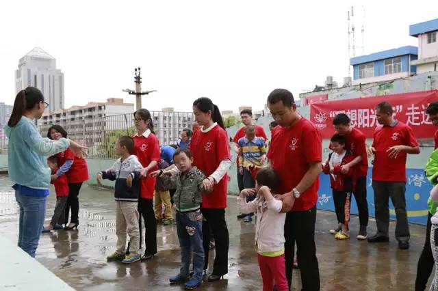 开始的时候,有孩子会主动跑来拉着我们的手,想和我们玩耍,忽然又害羞地笑着跑掉了,最后又试探的走过来。到了游戏环节,孩子们已经开始粘着我们了,中心的老师惊讶地说:“中心的大多数孩子都不会说话,也不懂得互动,连简单的眼神交流都不会。没想到今天和你们互动得那么好。”
