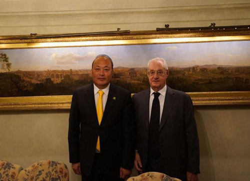 2015年6月23日晚,应意中基金会的邀请,赴意大利考察访问的天狮集团李金元董事长参加了由意中基金会主席罗米蒂先生亲自安排的欢迎家庭晚宴,并与罗米蒂主席进行亲切友好交流,双方畅谈中意两国人民友谊,探讨文化交流与产业合作发展。