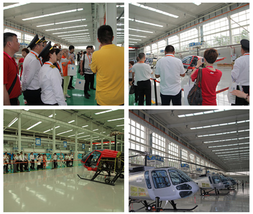 重庆通航公司工作人员为参观“恩斯特龙直升机”生产线的飞行体验者讲解