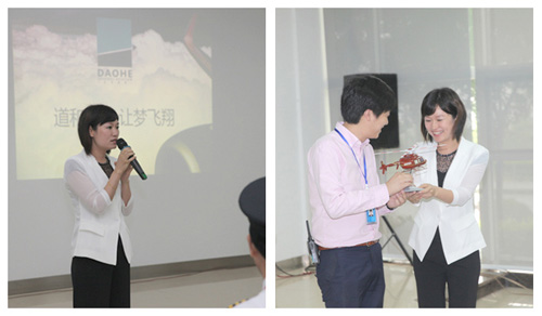 (左图)道和通航营销副总经理黄总讲述道和通航与重庆通航强强联手的战略合作关系(右图)道和通航营销副总经理黄总向重庆通航吴波先生赠送贝尔407GX机模