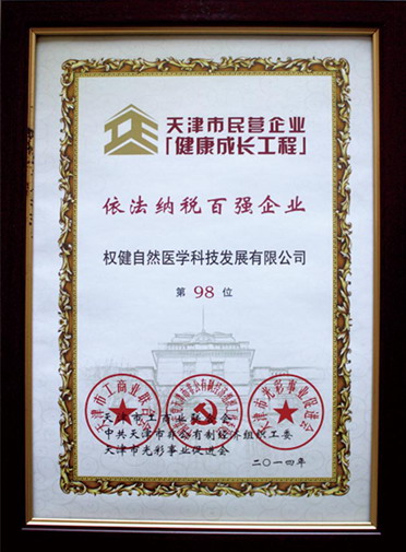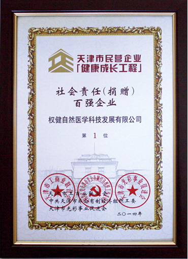 近日,由天津市工商业联合会、中共天津市非公有制经济组织工委等部门联合举办的“天津市民营企业健康成长工程”新闻发布会在天津大礼堂隆重召开,经过严格审查、筛选,权健从参选的5000多家企业中脱颖而出,荣获“社会责任(捐赠)百强企业”(第1位)和“依法纳税百强企业”(第98位)称号。